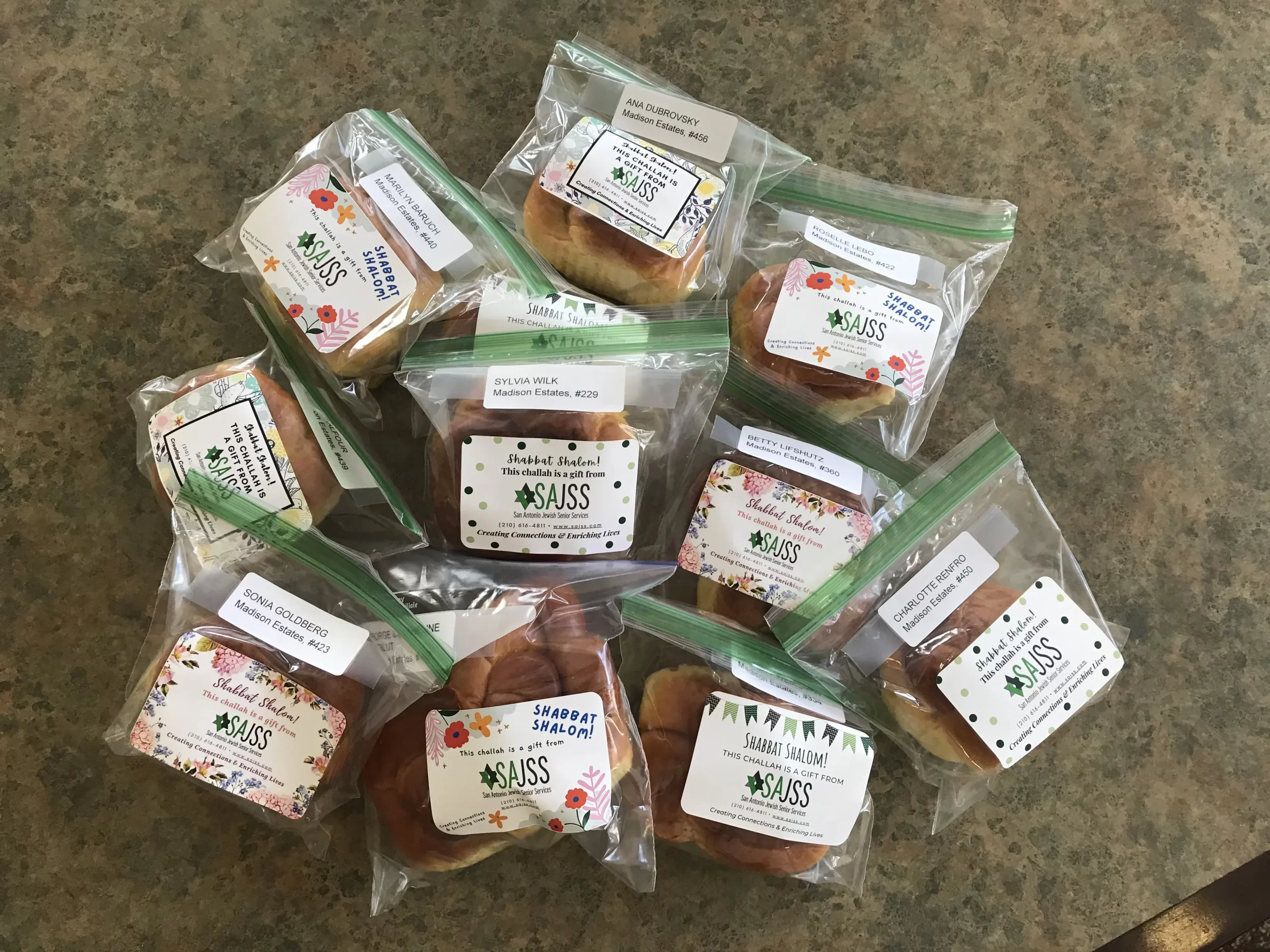 San Antonio Jewish Senior Services is happy to purchase and deliver challah to Jewish older adults in our community. We hope to make Shabbat and holidays special for everyone in the Jewish community. Â Thank you to all our SAJSS volunteers for delivering with smiles. Without you we wouldn’t be able to do what we do!